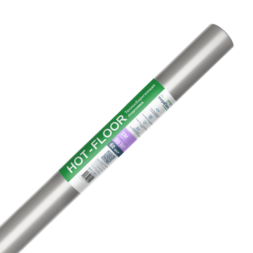 Подложка для теплого пола Megaflex Hot-Floor 60 предназначена для отражения теплового излучения. Она помогает утеплителю и как зеркалу отражать тепло вверх, делая минимальным нагрев нижнего слоя цементной плиты перекрытия. Все получаемое тепло при нагреве теплого пола идет на нагрев именно необходимой зоны верхней части. Нанесённая на теплосберегающую подложка разметка облегчает монтаж трубопровода или электрического, а так же и инфрокрасного теплого пола. На верхнем слое пленки нанесена печать для правильного размещения отопительных труб или электрического провода в процессе монтажа «теплого пола». Выпускается подложка толщиной 60 микрон.